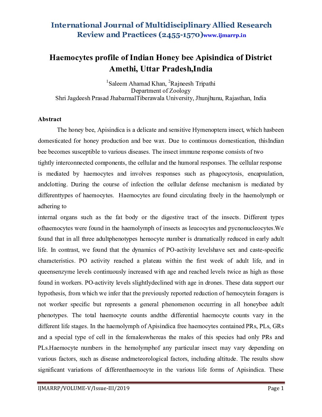 Haemocytes profile of Indian Honey bee Apisindica of District Amethi, Uttar Pradesh,India